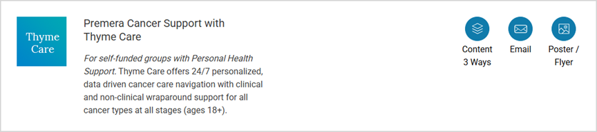 Are you a self-funded group with Personal Health Support? You can find materials in B’link to share with your employees about Premera Cancer Support with Thyme Care in the Managing a Condition or Pregnancy category.